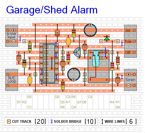 It has an extremely small standby current - making it ideal for battery-powered operation. This is particularly useful where your garage/shed has no mains supply. I've used a 9-volt battery in the diagram - but the circuit will work at anything from 5 to 15-volts. Just choose a Relay and Siren suitable for the voltage you want to use.