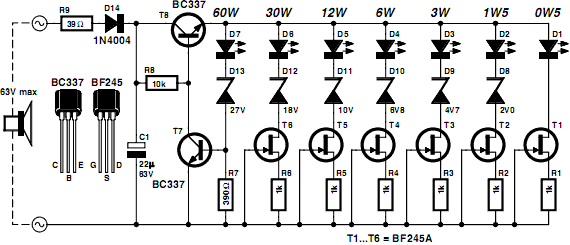 Although this is a passive VU meter, it contains active components in the form of two transistors and six FETs. Seven LEDs light up in steps to show how much power is being pumped into the loudspeaker. The steps correspond to the power levels shown in the schematic for a sine-wave signal into an 8-ohm load. LED D1 lights up first at low loudspeaker voltages. As the music power increases, the following LEDs (D2, D3, and so on) light up as well. The LEDs thus dance to the rhythm of the music (especially the bass notes).