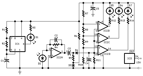 This circuit is designed to aid in parking a vehicle near a garage wall during reverse maneuvers. LED D7 illuminates approximately 20 cm from the bumper, D7+D6 illuminates around 10 cm, and D7+D6+D5 indicates a distance of about 6 cm. These indicators provide alerts when approaching too closely to the wall. These distances can vary depending on the specifications of the used infra-red transmitting and receiving LEDs, and are primarily influenced by the color of the reflecting surface. Dark surfaces significantly reduce the device’s sensitivity. Consequently, this circuit can be employed in various applications such as liquid level detection or proximity sensing devices.