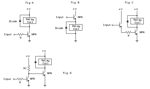 Figure D can be used to reverse the relay action so that it engages when the input is low and disengages when the input is high. The R value is determined the same as in Figure A. The R1 value should be high enough to ensure saturation of the first stage and low enough to saturate the second stage. For example, if a 12 volt relay coil requires 100 mA and the driving transistor gain is 50, then the base current will be 100/50= 2 mA and the R1 value must be less than 6000 ohms so that 2 mA does not drop more than the supply voltage of 12. If the first transistor gain is 50 and the input current is 100 microamps, the collector current will be 5 mA and the R1 value must be greater than 2400 ohms so that 5 mA drops the entire supply voltage of 12. So we need to select something between these two limits of 2.4K to 6K, something around 4.3K would be near the midrange.