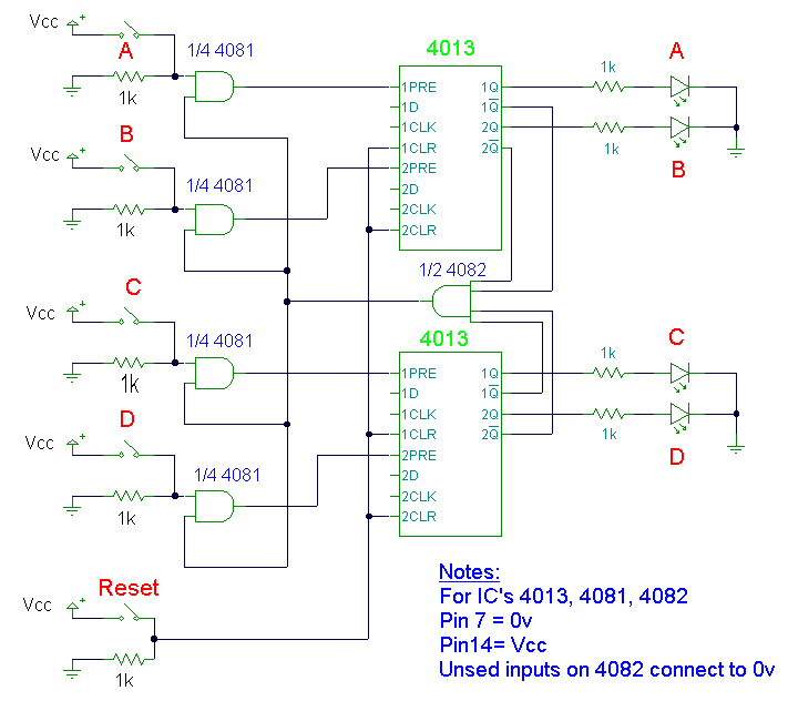 Activating the reset switch will restore the entire circuit to its initial state, clearing all flip-flops and extinguishing any illuminated LED's. Under this condition, the Q outputs will be low (logic 0), and the NOT Q outputs will be high (logic 1). All four NOT Q outputs are connected to an input of a 4-input AND gate (4082), whose output will also be high. The output of the 4082 is wired to an input of each 2-input AND gate (4081). The input switches A, B, C, and D are non-latching push buttons. The first individual to depress their corresponding switch will cause the linked AND gate (4081) to become high, triggering the preset input of the dual 4013 D-type flip-flop. This, in turn, will latch and illuminate the appropriate LED. Furthermore, the triggered flip-flop will have its NOT Q output set to low, which changes the 4082 output to low, thereby preventing further activation of the other flip-flops. De-bouncing of switch contacts is not necessary, as the initial press will latch one of the bistable states. Activating the reset switch will restore the circuit to its previous state. It is recommended to use robust push button switches, as they may be subjected to stress during operation.