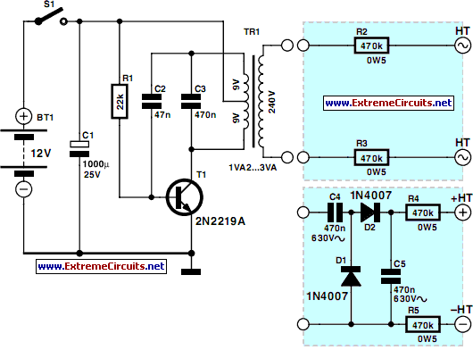Here’s a project that could be useful this summer on the beach, to deter anyone from touching your belongings left on your beach towel while you’ve gone swimming; you might equally well use it at the office or workshop when you return to work. In a very small space, and powered by simple primary cells or rechargeable batteries, the proposed circuit generates a low-energy, high voltage, in the order of approximately 200 to 400 V, harmless to humans, of course, but still capable of delivering a rather unpleasant ‘shock’ to anyone who inadvertently touches it.