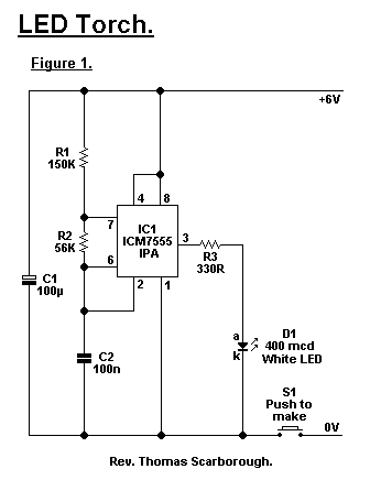 The LED Torch is constructed around a 7555 timer operating in oscillating mode (do not employ a standard 555 timer). A white LED (Maplin order code NR73) generates 400 mcd of light output, which, when concentrated, can brighten objects at a distance of 30 metres. Explore Conrad Electronic for a potentially more powerful white LED (order code 15 37 45-11).