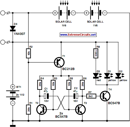 This circuit has been created as a hazard indicator to notify other road users about potential dangers in low-visibility conditions. It can also function as a bicycle light, provided it adheres to all relevant traffic rules and legal requirements. White LEDs are advised when utilizing the circuit as a front light for a bicycle – specifically for illuminating the road ahead, while red LEDs are recommended for usage as a rear light. When sunlight is available, the two 1.6-V photovoltaic cells charge the two AA batteries. At night, the photovoltaic cell voltage vanishes, and the batteries automatically power the circuit. The flashing rate is approximately one pulse per second, and the LED illumination duration is approximately 330 ms.