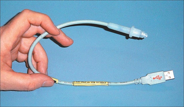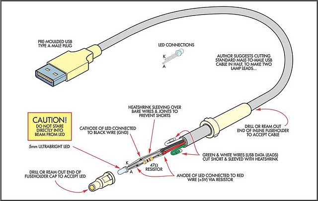 Well, here’s the answer. We’ve called it the Itsy Bitsy USB Lamp. It is such a delightfully simple idea we’re wondering why no-one ever thought of it before. It began as a student project at Massey University in Wellington, New Zealand - and was submitted to us by the lecturer, Stan Swan. When we say simple, we mean it: just a USB plug on a suitable length of cable, a super bright white LED and a series resistor to limit LED current. The LED and resistor are housed in an in-line fuse holder (without its innards!) which makes a superb little “wand” and also protects the electronics, such as they are.