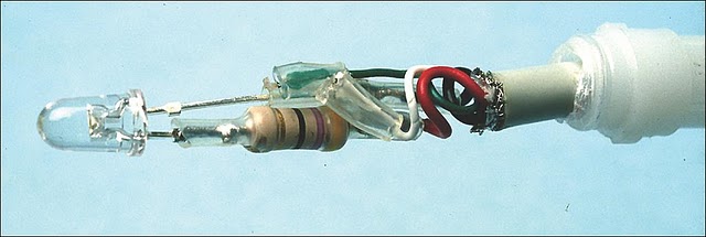 Cut the anode lead (the longer lead) of the bright white LED to about 3mm long. Similarly, cut both leads of a 47Ω 1/4W (or even 1/8W) resistor to about 3mm long and carefully solder one lead of the resistor to the anode of the LED. The 47Ω resistor will have a colour code of yellow, purple, black, gold (or yellow, purple, black, gold, gold if it’s a 5-bander).