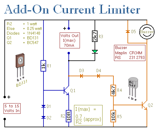 I used a BD131 because that was what I had available. However, any NPN Power Transistor with a similar - or better - spec should work fine. I had no special reason for choosing a 70mA maximum. If you want to set a different current limit - change the value of R2. The formula is in the diagram. Always remember that if you increase the current - you'll also increase the watts.