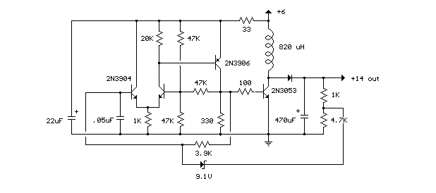 In this miniature power supply, a Schmitt trigger circuit is employed to manage a switching transistor, which then provides power to a smaller inductor. Magnetic energy accumulates within the inductor during the transistor’s conduction phase and is subsequently discharged into the load circuit upon the transistor’s transition to a non-conducting state. The output voltage is intrinsically linked to the load resistance and is constrained by a zener diode, effectively terminating the oscillation when the voltage reaches approximately 14 volts. Adjustments to the voltage divider supplying the zener diode enable variations in the resultant voltage levels. The system exhibits an efficiency of around 80% thanks to the utilization of a high Q inductor.