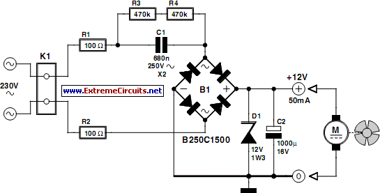 This circuit idea is certainly not new, but when it comes to making a trade-of between using a small, short-circuit proof transformer or a capacitive voltage divider (directly from 230 V mains voltage) as the power supply for a fan, it can come in very handy. If forced cooling is an afterthought and the available options are limited then perhaps there is no other choice. At low currents a capacitive divider requires less space than a small, short-circuit proof transformer.
