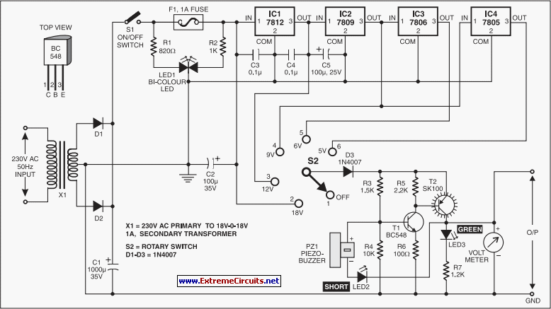 This circuit furnishes four distinct regulated voltages – 12V, 9V, 6V, and 5V – alongside an unregulated 18V output, selectable via rotary switch S2. The chosen output level is displayed on the analog voltmeter connected to the output terminals. The circuit employs a standard 18V-0-18V, 500mA step-down transformer to generate 18V AC. A rectifier diode consisting of diodes D1 and D2 provides 18V DC, which is subsequently smoothed by capacitor C1 and supplied to the combination of regulator integrated circuits (IC1 through IC4).