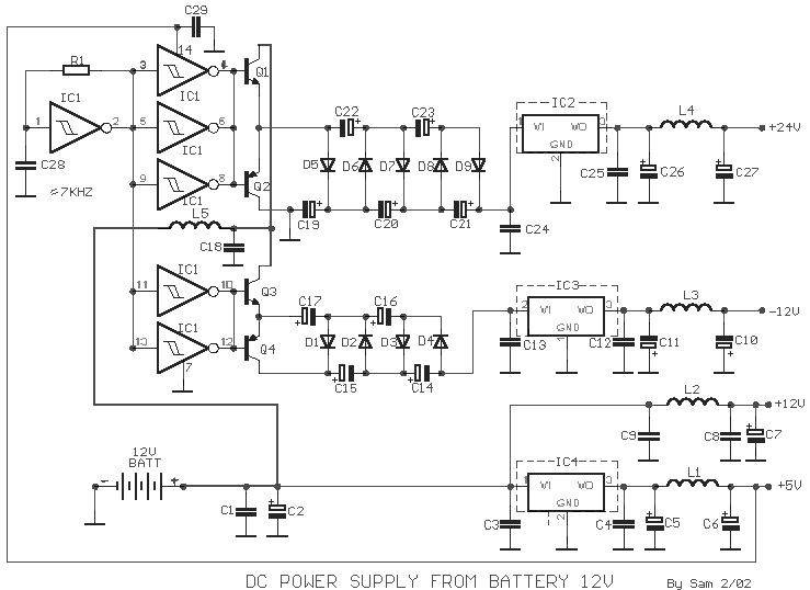 Many times we needed a variety of voltages, from a battery 12V. With the circuit, we can take voltages smaller or bigger, positive or negative, from a battery 12V. The idea is based in oscillator roughly 7KHZ, round the R1, C28, that lead the remainder gates of IC1, that are connected at the parallel, (so that they provide the essential current of drive), that drive with the line their transistors Q1 until Q4. Then exist two circuits of "cascade" constituted from diodes and capacitors, D1 until D4, C14 until C17 for the negative and D5 until D9, C19 until C23 for the positive voltage, that drive the corresponding stabilizers. In the outputs of stabilizers exist inductors, which they remove and the last remains of oscillation. The current that we can take from the outputs are order the 100 until 200 mA. The total time that will capacity of battery it gives the current that we want, it's up to from her capacity on Ah, as long as more so much more time. All the transistors and the stabilizers, good it is they are placed in a heatsink, in order to it remove the produced heat.