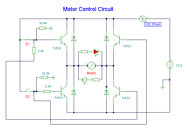 In this configuration, S1 and S2 are initially off-state push-to-close switches. The semiconductors are available in red or green coloration and serve solely as visual cues for polarity. Adjustment of the TIP31 transistors might be required according to the motor’s specifications. It is important to acknowledge that operation under load results in increased current draw. This design was created for powering a small motor intended for controlling the movement of window coverings. A key benefit compared to automatic systems is the ability to precisely manage the amount of illumination entering a room. The four diodes surrounding the motor are back EMF diodes, selected to appropriately match the motor's characteristics. For a 12V motor consuming 1amp when under load, 1N4001 diodes are typically utilized.
