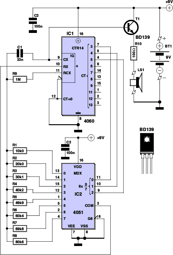 The frequency of the oscillator decreases as the resistance between pin 10 of IC1 and the junction of C1 and R9 increases, and the lower the frequency of the oscillator, the longer the counter remains in its current state. This means that high frequencies present on pin 9 are generated for shorter times than low frequencies. The values of resistors R1–R8 increase in uniform steps of approximately 10kO, with the result that the output on pin 9 is a series of eight decreasing frequencies, and this series is constantly repeated in cyclical fashion. Transistor T1 (BD139) and resistor R10 are included to boost the signal from pin 9 to a level suitable for driving a loudspeaker.