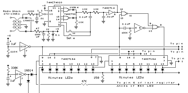The circuit presented below employs a total of 60 individual LEDs to visually represent the minutes of a clock and 12 LEDs are used to indicate the hours. The power supply and the fundamental timing circuitry are identical to those utilized in the previously detailed 28 LED clock circuit. The minute section of the clock is constructed from eight instances of the 74HCT164 shift registers, cascaded sequentially, enabling a single bit to be repeatedly circulated through the 60 stages, accurately displaying the desired minute of the hour. Only two of the minute shift registers are visually depicted, connected to 16 LEDs. Pin 13 of each register is connected to pin 1 of the subsequent register, spanning seven registers. Pin 6 of the eighth register should be connected back to pin 1 of the initial register via a 47K resistor. Pins 2, 9, 8, 14, and 7 of all eight minute registers (74HC164) are connected in parallel (pin 8 to pin 8, pin 9 to pin 9, and so on). The hour section incorporates two 8-bit shift registers, operating similarly to the minute registers to display one of twelve hours. Pin 9 of all 74HCT164s (hours and minutes) is connected together. For a 50 Hertz operation, the time base section of the circuit can be modified as shown in the lower drawing labeled "50 Hertz LED Clock Time Base". This requires an additional IC, the 74HC30, as it necessitates decoding 7 bits of the counter instead of 4. The two dual-input NAND gates (1/2 74HC00) that are not utilized in the 50 Hertz modification should have their inputs connected to ground.