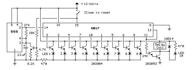 This schematic demonstrates a visual nine-second postponement utilizing ten light-emitting diodes before activating a twelve-volt relay. Upon actuation of the reset switch, the 4017 decade counter will be returned to its initial zero state, causing the LED driven from pin 3 to illuminate. The output from the 555 timer at pin 3 will maintain a high state and the voltage across pins 6 and 2 of the timer will be approximately three volts. When the switch is deactivated, the transistor operating in parallel with the timing capacitor (22uF) is disabled, permitting the capacitor to begin charging and the 555 timer circuit to generate a roughly one-second timing pulse to the decade counter. The counter increments with each rising edge at pin 14, and this operation is enabled by pin 13 being at a low voltage level. Once the ninth count is achieved, pins 11 and 13 will be active, halting the counter and powering the relay. Increased delay durations can be achieved by using a larger capacitor or a greater resistor across pins 2 and 6 of the 555 timer.