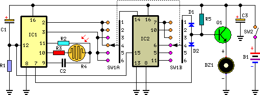 - BZ1 = Piezo sounder (incorporating 3KHz oscillator)