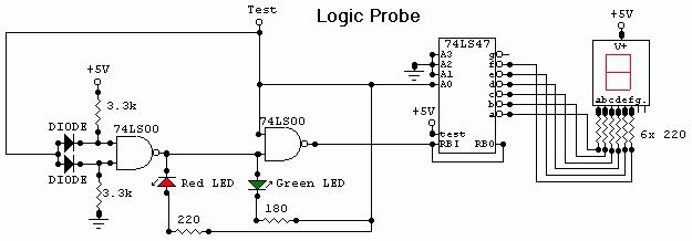 This schematic represents a Logic Analyzer. It determines the logical state of any TTL logic circuit’s point. For operation, the device requires supplying power matching the circuit being examined – identical Vcc and GND supplies are necessary. To ascertain the logical level, the "Test" wire of the analyzer must be connected to the specific node within the circuit under inspection.