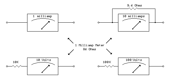 A microampere meter can be utilized as a voltmeter by incorporating a series resistance. The required resistance is determined by dividing the complete-scale voltage reading by the complete-scale current of the meter movement. Consequently, when utilizing a 1 microampere meter and aiming to measure a range of 0-10 volts, a total resistance of 10/0.001 = 10,000 ohms is necessary. The meter movement possesses a small inherent resistance, which constitutes a minor component of the overall 10,000 ohms, and it’s generally negligible. The meter in the example below has a resistance of 86 ohms, meaning the actual resistor value needed would be 10,000 - 86, or 9,914 ohms. However, employing a 10,000 standard value is within 1% accuracy, rendering the 86 ohms insignificant. For a complete-scale reading of 1 volt, the meter’s resistance becomes more prominent, accounting for approximately 8% of the total 1,000 ohms required. Therefore, a 910 ohm resistor, or a 910 standard value, would likely be preferred. The microampere meter can also be employed to measure elevated currents by adding a parallel resistance. The meter’s resistance now plays a considerably larger role, as increasing the range by a factor of ten necessitates bypassing 9/10 of the total current via the parallel resistor. To transform the 1 microampere meter into a 10 microampere meter, a parallel resistor of 86/9 = 9.56 ohms is needed.
